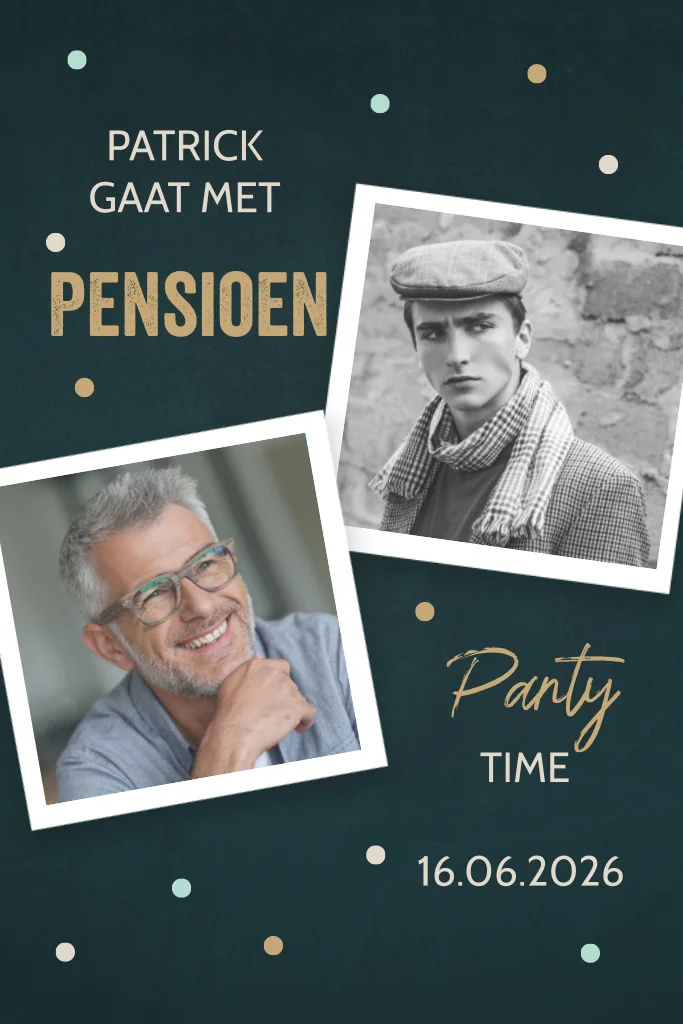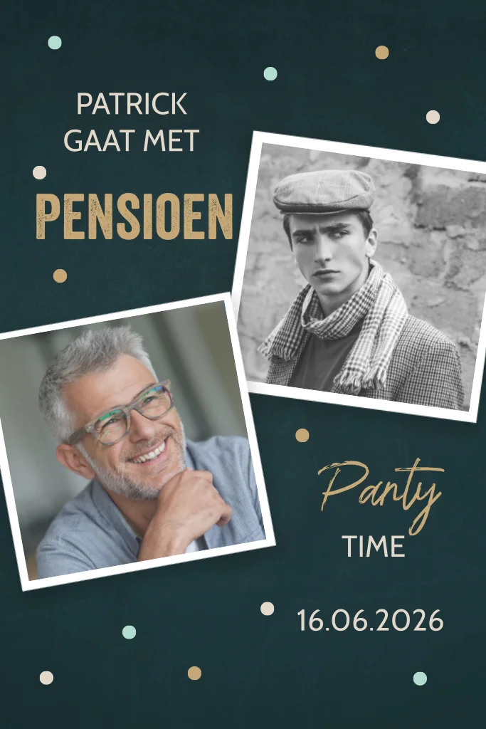 Trendy pensioen pensioenering uitnodiging met confetti en plaats voor enkele foto's op een donkere achtergrond. (24165)