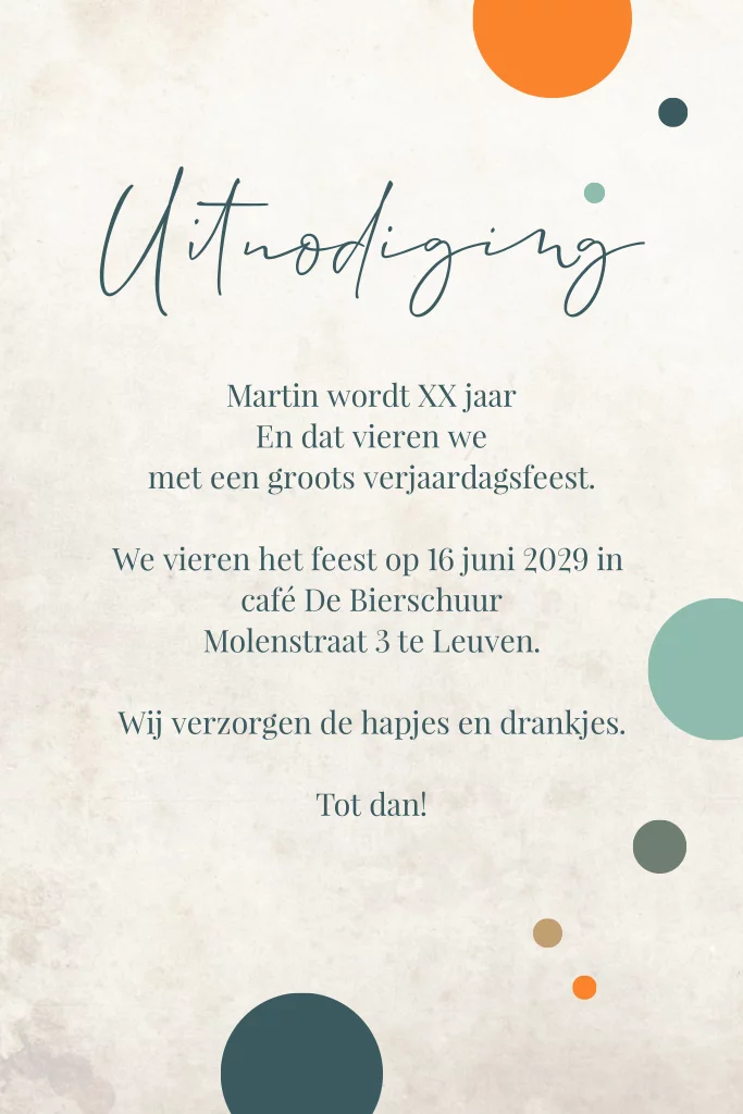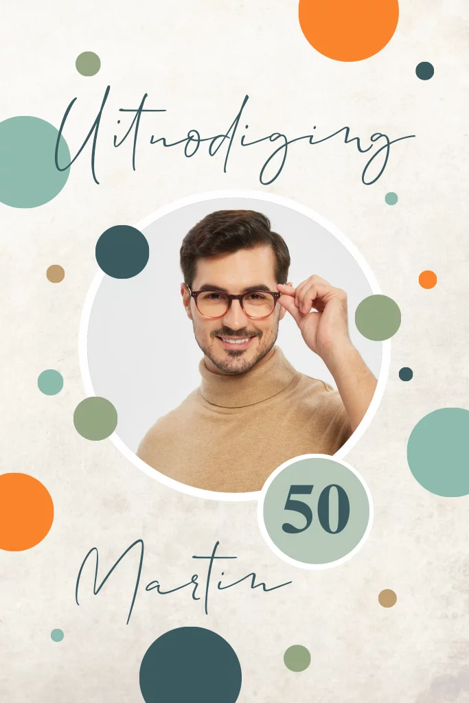 Uitnodiging voor een verjaardag voor een man 50 jaar met een foto feestje trendy met kleurrijke confetti en ruimte voor een eigen foto. (24374) (Dit kaartje heeft nu ronde hoeken a € 0,30 per kaartje)