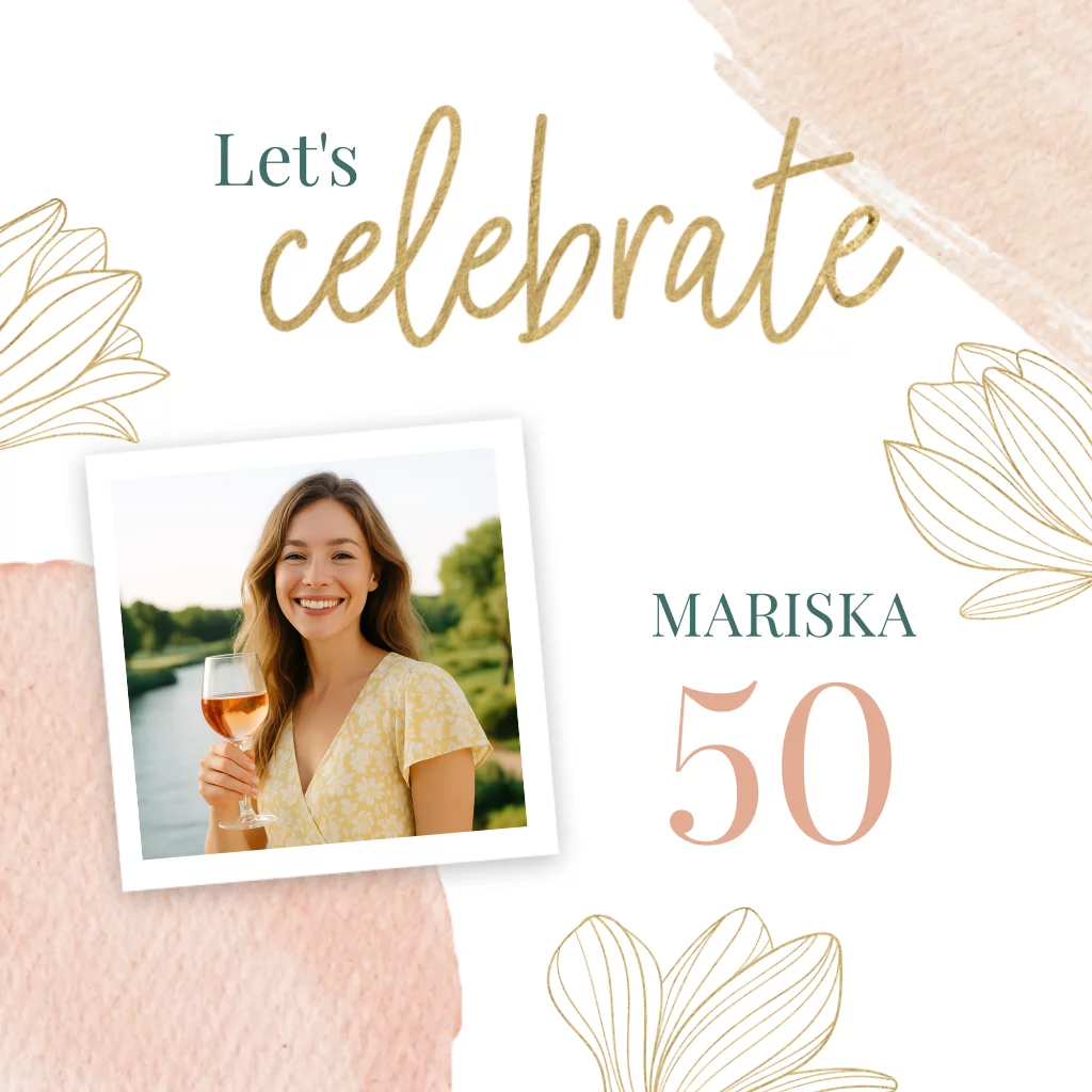 50 jaar uitnodiging met waterverf elementen en sierlijke bloemen. Ruimte voor een eigen foto van een vrouw. (23951)