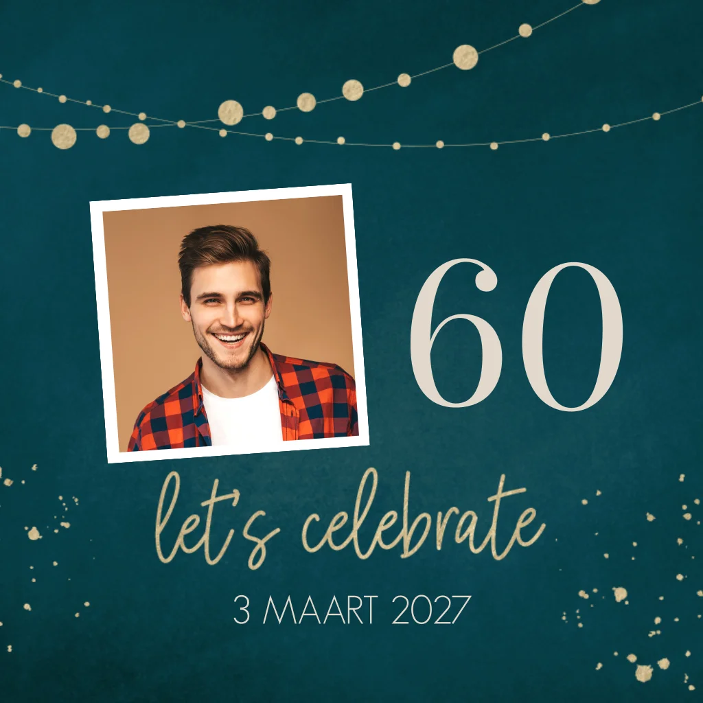 60 jaar man verjaardag uitnodiging met goudkleurige slinger en spetters op een donkere achtergrond. (23866)