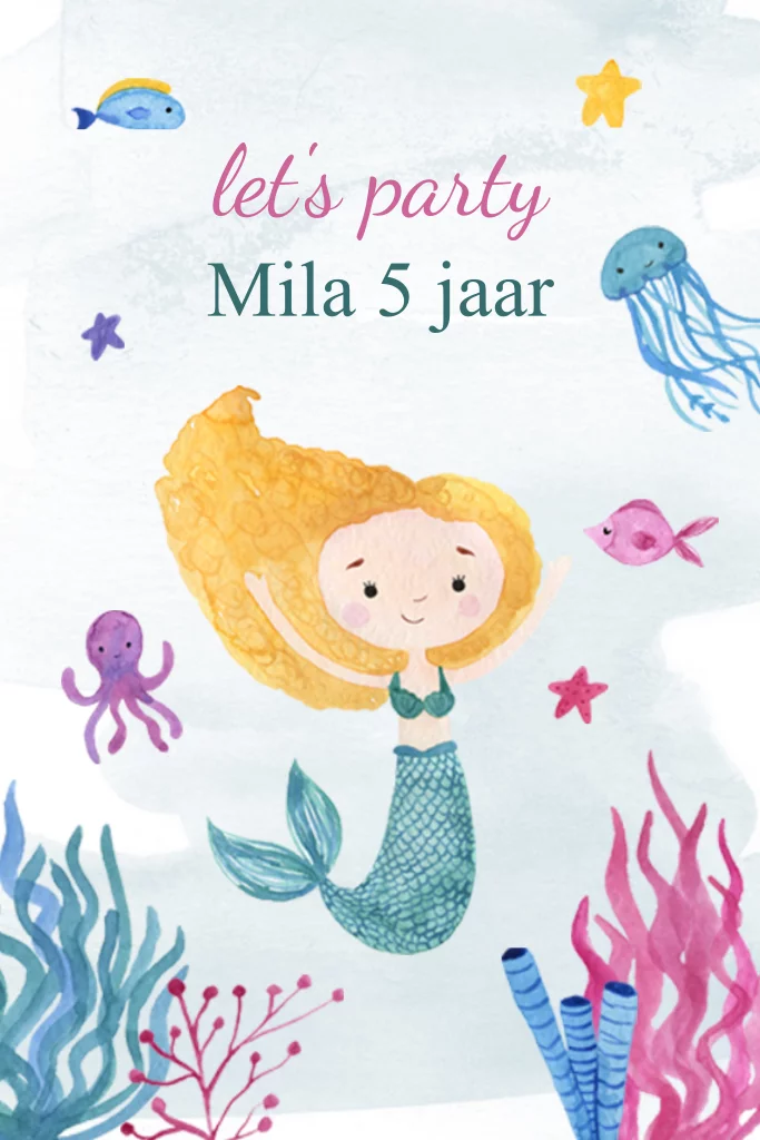 Leuke uitnodiging kinderfeestje zwemfeestje om te gaan zwemmen met vriendinnen met getekende zeemeermin en schattige visjes. (23750)