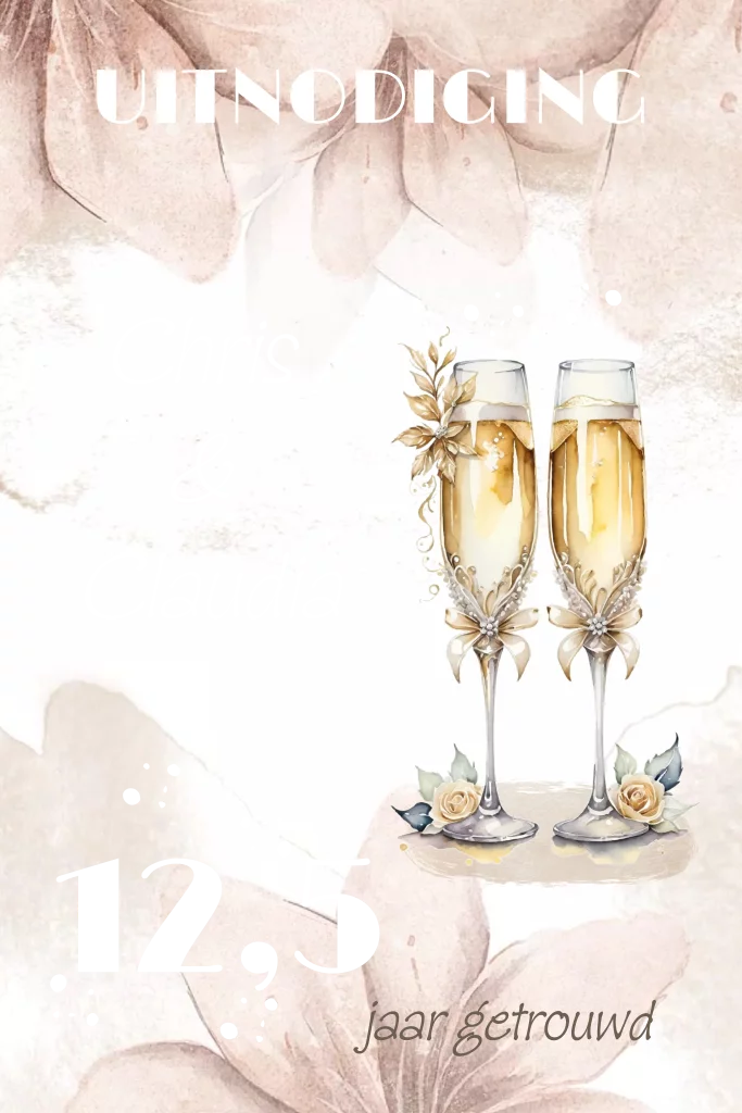 12,5 jaar getrouwd jubileum uitnodiging met champagne en roze bloemen