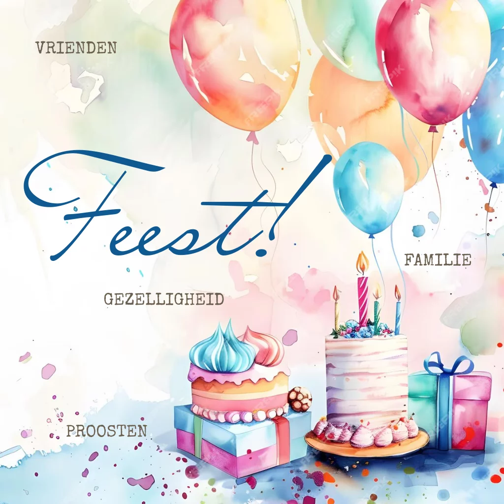 Feestelijke uitnodiging in aquarel voor een verjaardag of ander feestje met ballonnen, taart en cadeautjes. (24678)