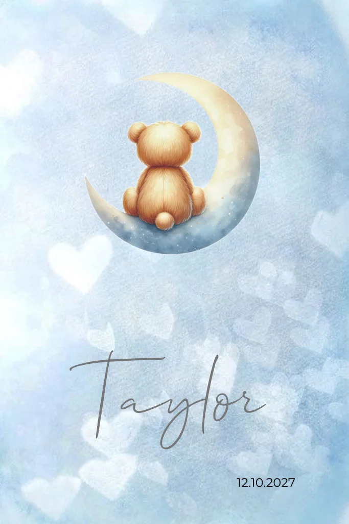 Jongens geboortekaartje voor een baby jongetje met een beertje die op de maan zit met een blauw achtergrond als lucht met hartjes (30301)