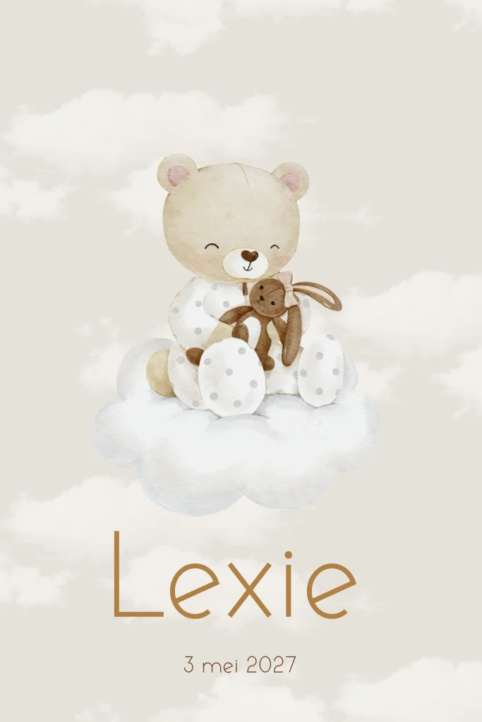 Geboortekaartje jongen beer aarde tinten met beertje op een wolkje