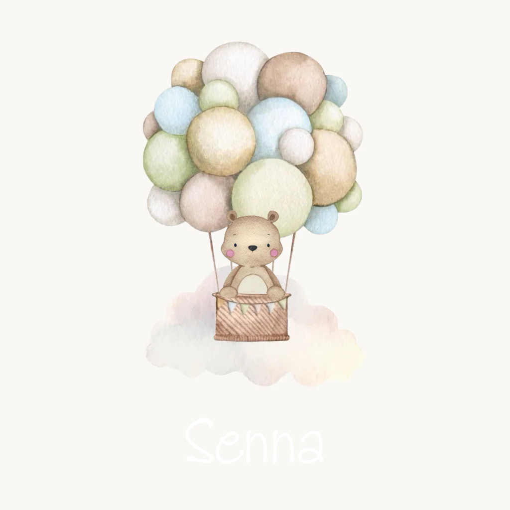 Geboortekaartje jongen met beer in een luchtballon met een wolk. De naam staat in glimmende goudfolie. Dit is mooi, maar kan ook met een gewone kleur inkt wat € 1 per kaartje voordeliger is (30322)