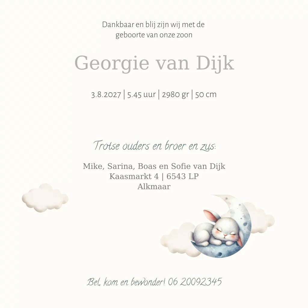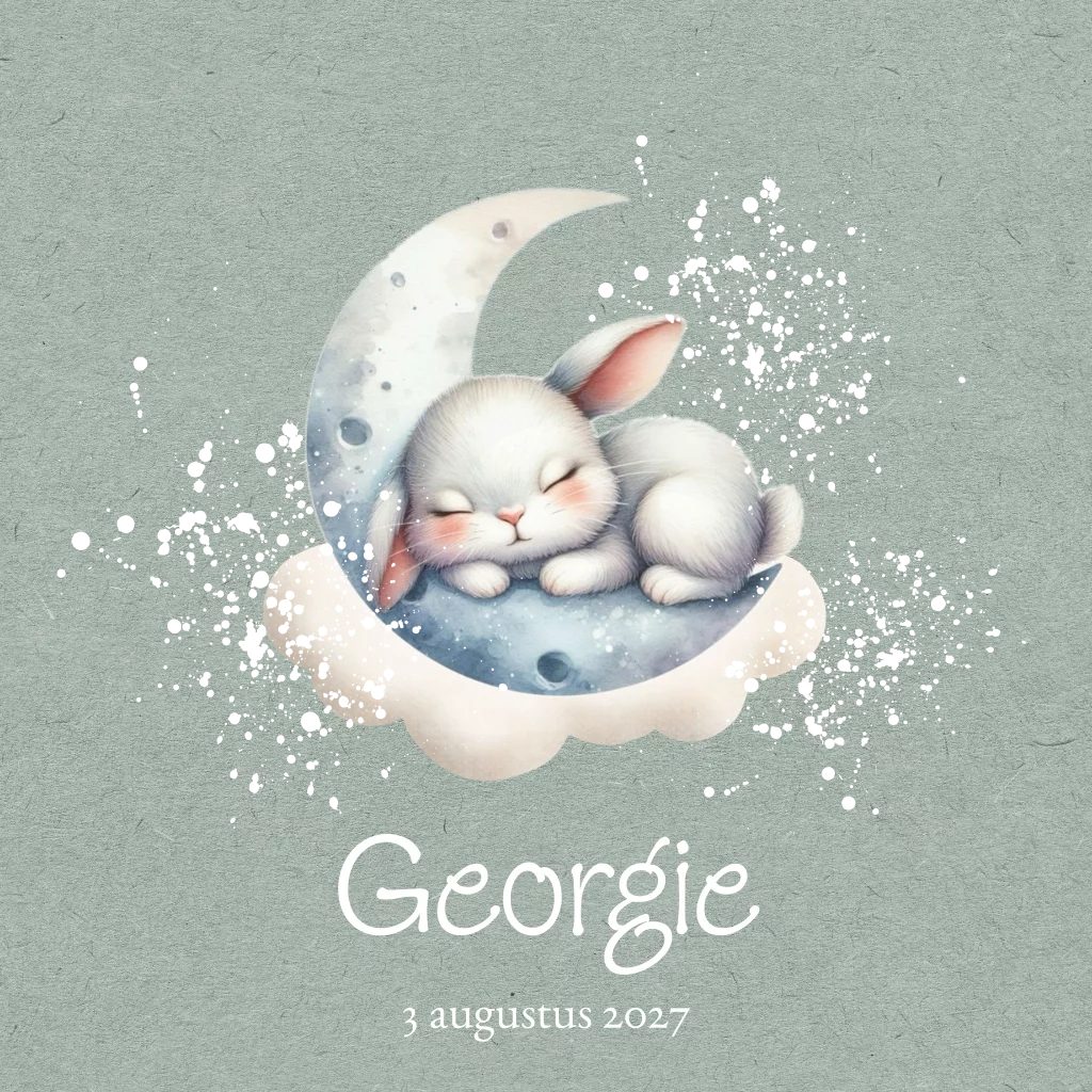 Geboortekaartje jongetje met een slapend konijntje op de maan