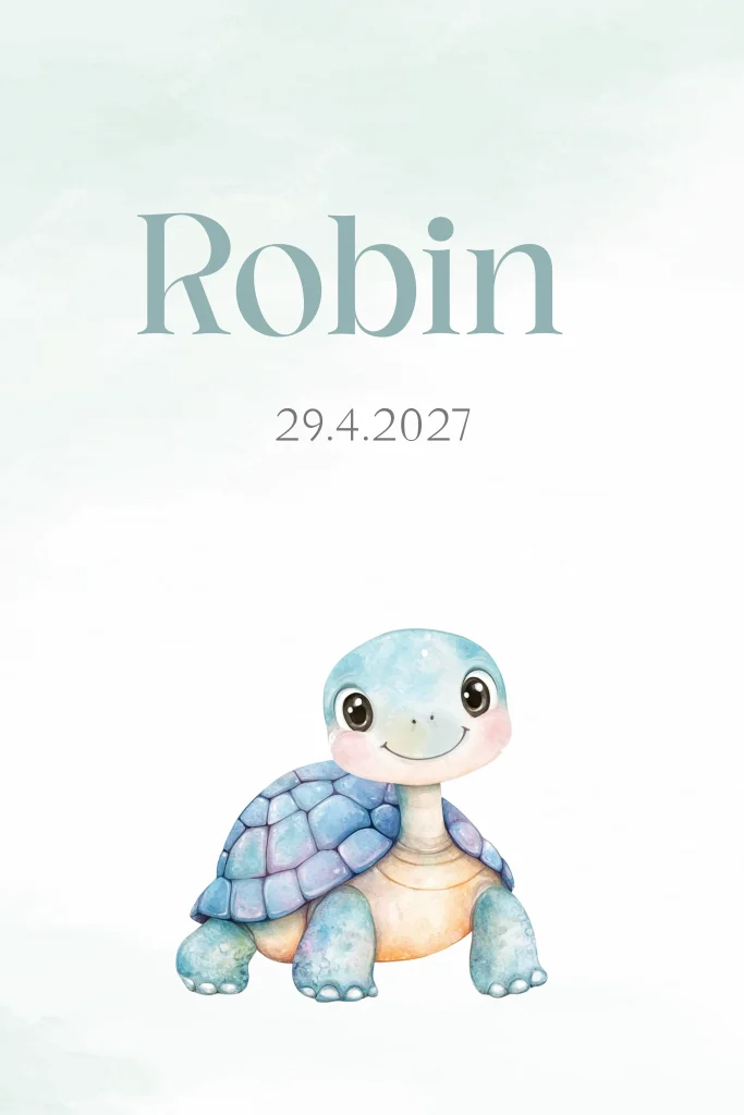 Geboortekaartje voor een jongen of meisje met een lief getekende schildpad en blauw groene aquarel op de achtergrond. (30320)