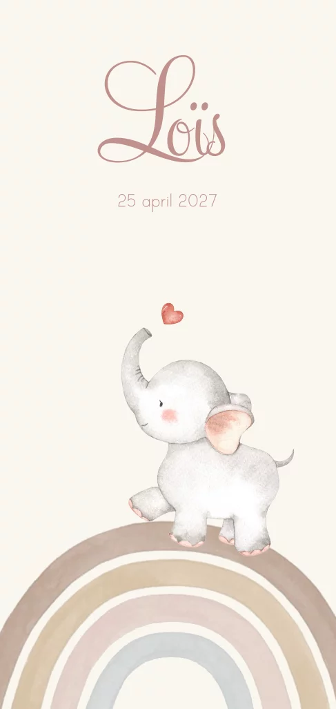 Lief en modern getekend geboortekaartje voor een meisje met een olifantje op een regenboog met een hartje. (23831)