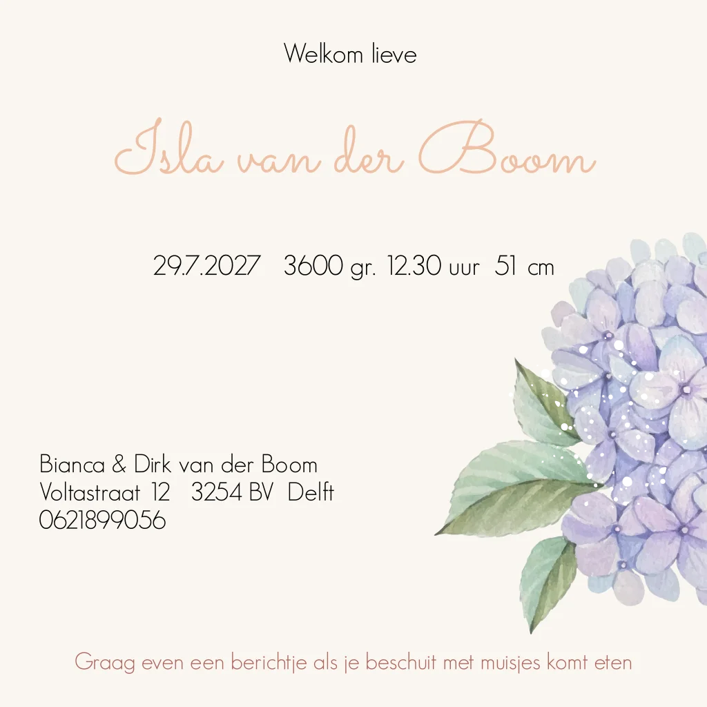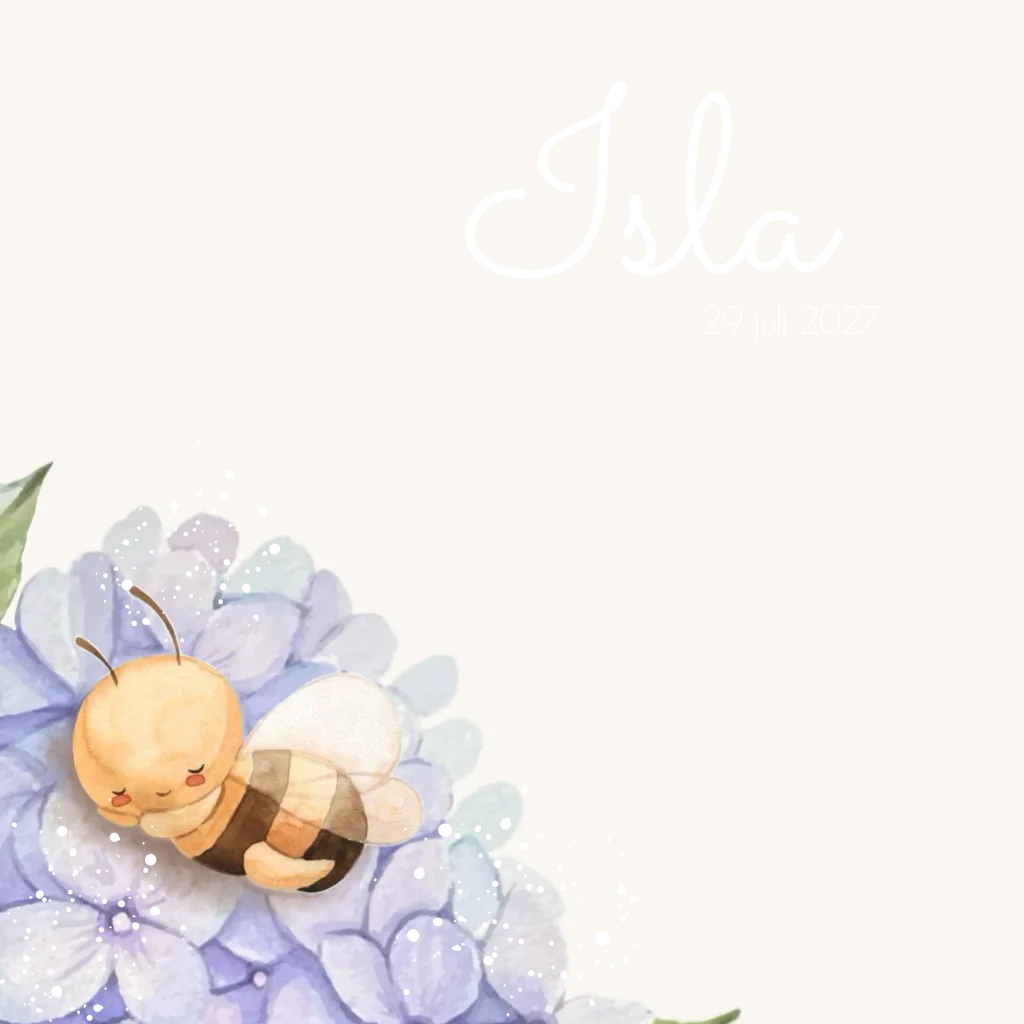 Geboortekaartje meisje met bijtje slapend op paarse bloem