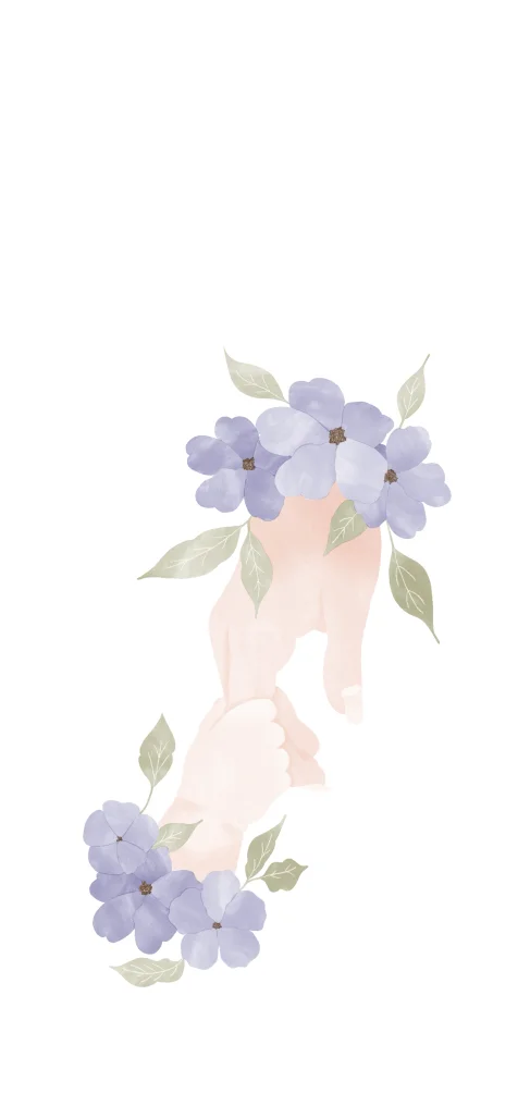 Klassiek geboortekaartje hand van moeder en baby met paarse en lila kleur bloemen. (23783)