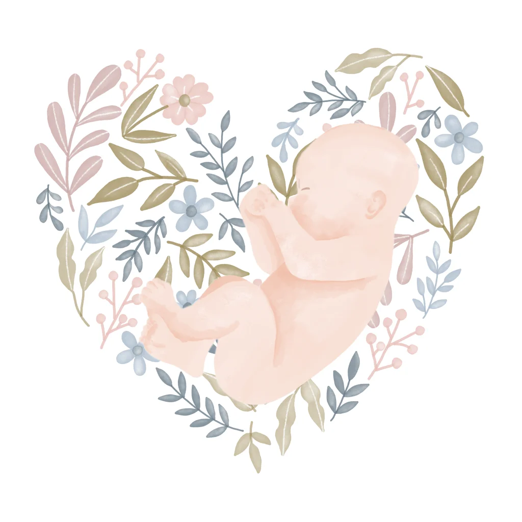 Lief getekend geboortekaartje met een baby in een hart van pastel kleurige bloemen. (23755)