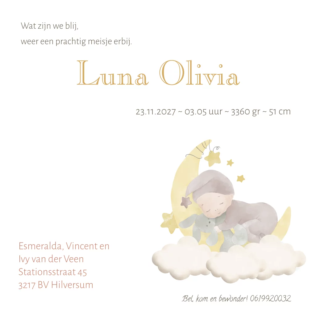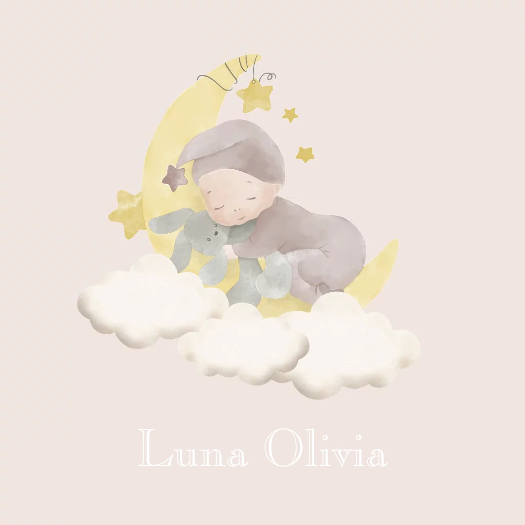 Geboortekaartje voor een meisje met een baby wat aan het slapen is op de maan met sterretjes en wolkjes. (23778)