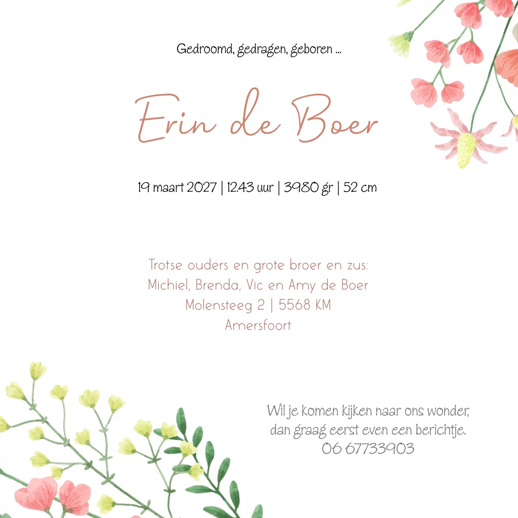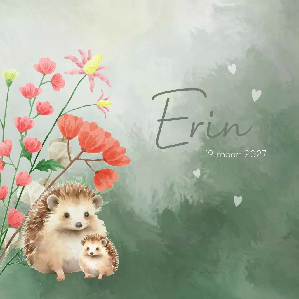 Geboortekaartje egel voor een meisje met gekleurder bloemetjes en 2 egeltjes. (24567)