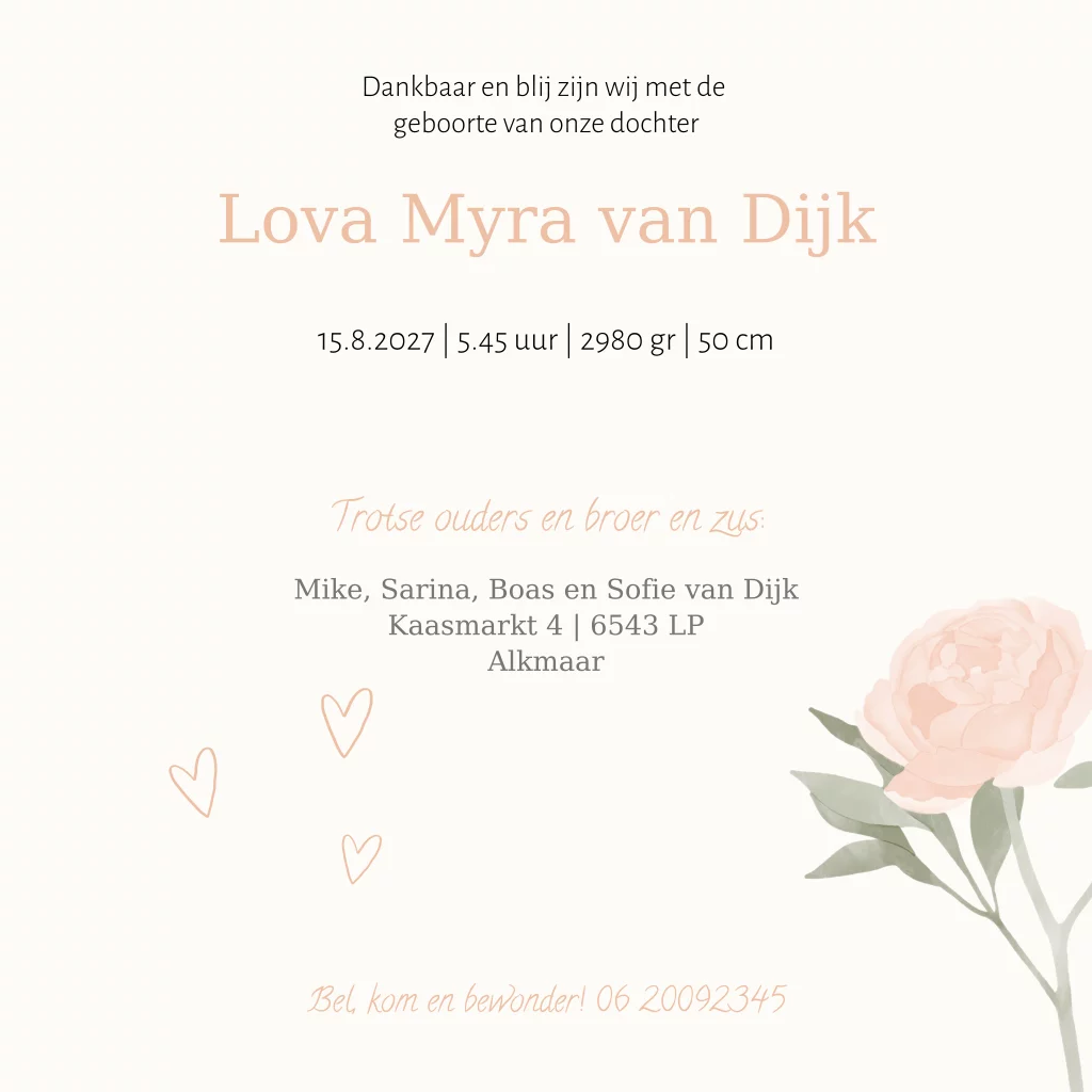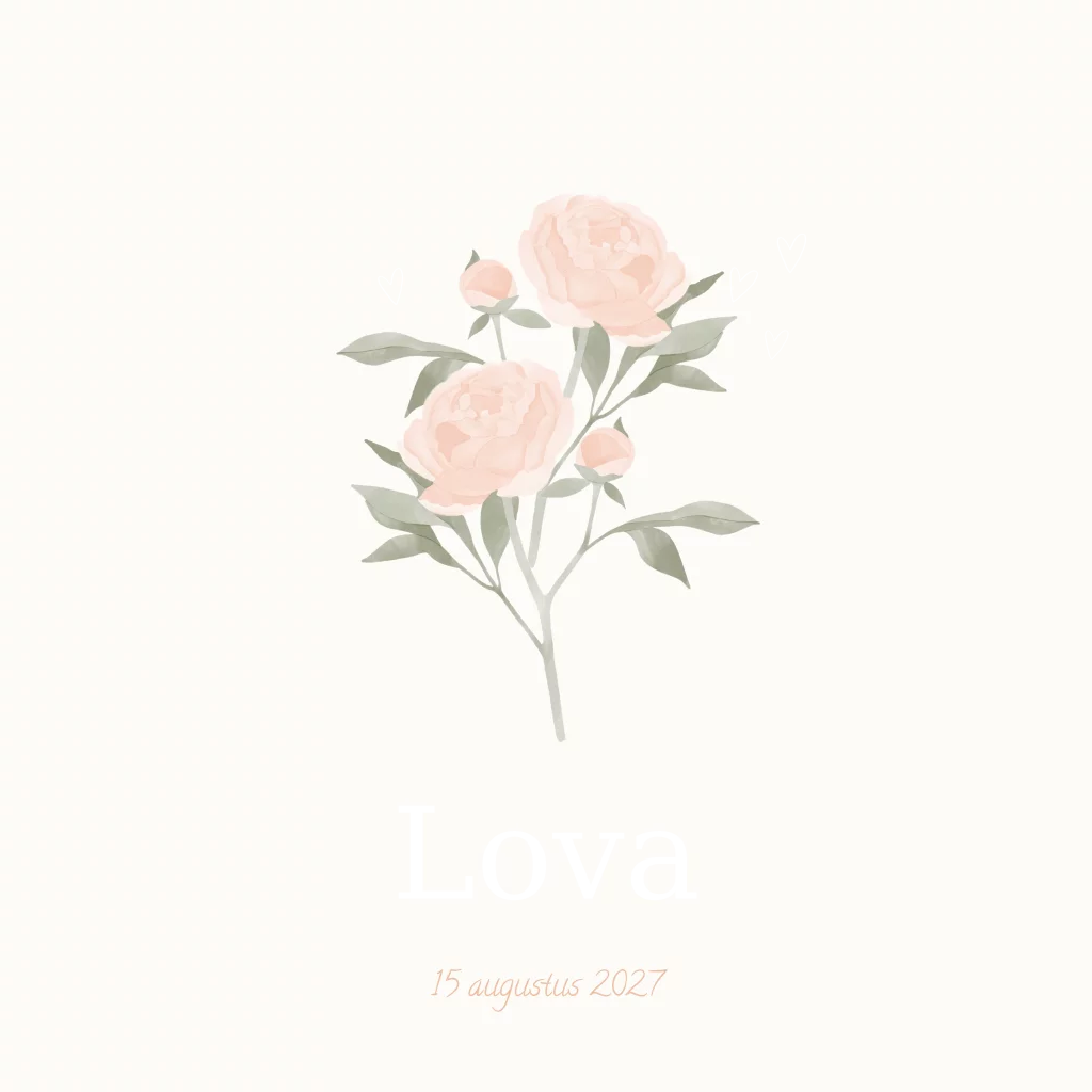 Geboortekaartje voor een meisje met zacht getekende lichtroze / roze rozen en hartjes. (23823)