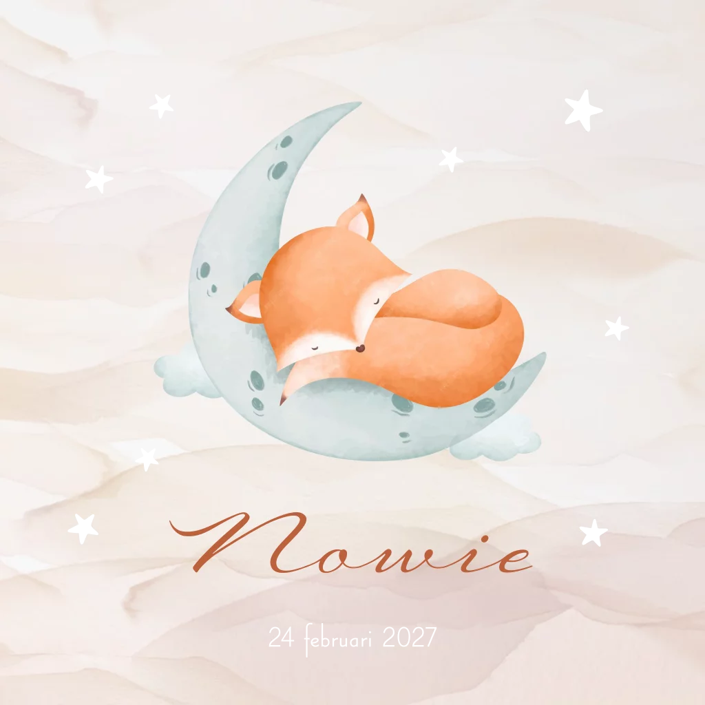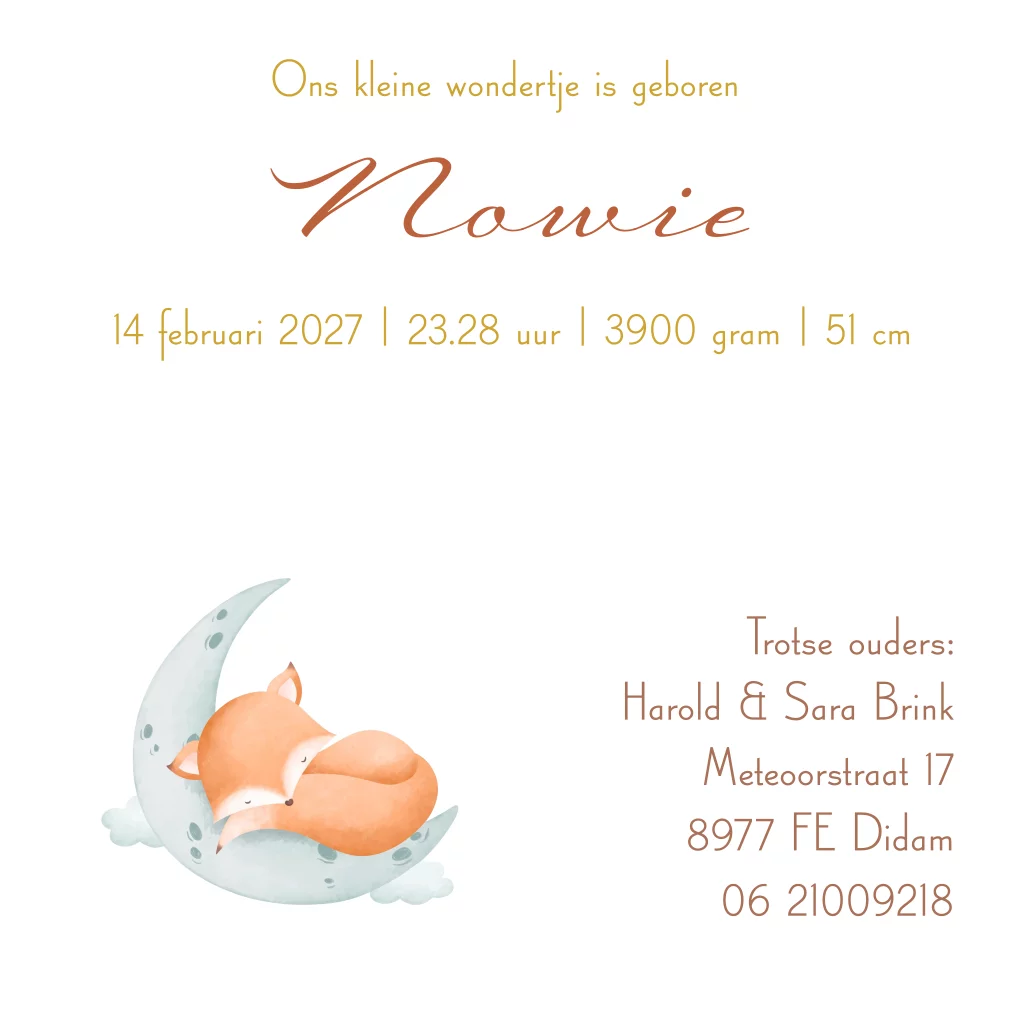 Geboortekaartje vosje voor een jongen of meisje met een slapend vosje op maan met goudfolie sterretjes. (24560)