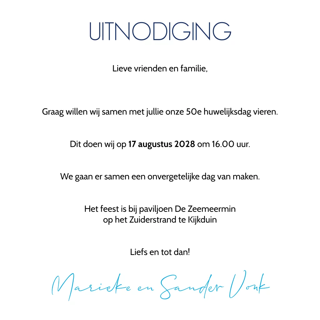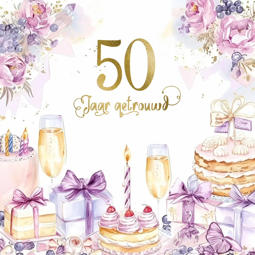 50 jaar getrouwd uitnodiging feestelijk met taart en champagne glazen