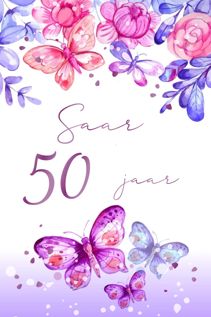 50 jaar uitnodiging paars roze met vlinders en bloem