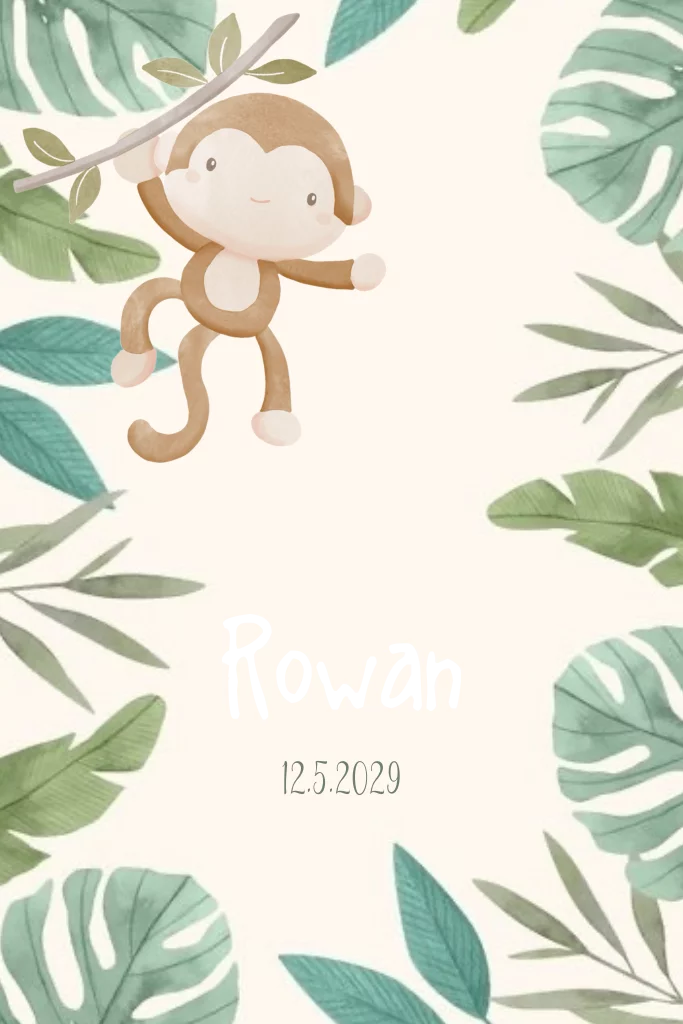 Jungle-thema geboortekaartje voor een baby jongen met hangend aapje aap in de bomen met bladeren. (23789)