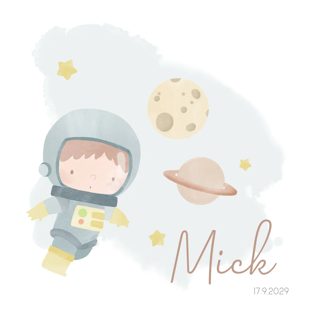 Lief getekend geboortekaartje voor een jongen met astronaut in de ruimte met maan, sterretjes en planeet. (23753)