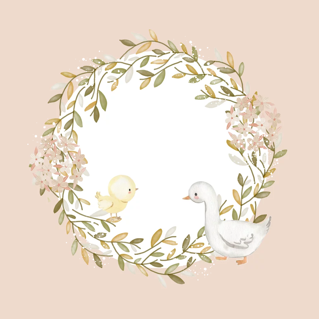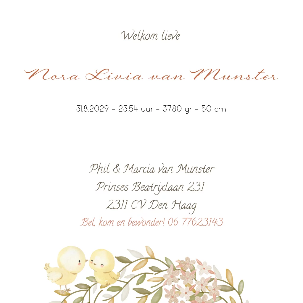 Geboortekaartje voor een meisje met een bloemenkrans, een gansje en vogeltjes. Dit kan ook gebruikt worden voor een tweede kindje. Grote broer zus als gans en een klein kuikentje voor de baby. (23839)