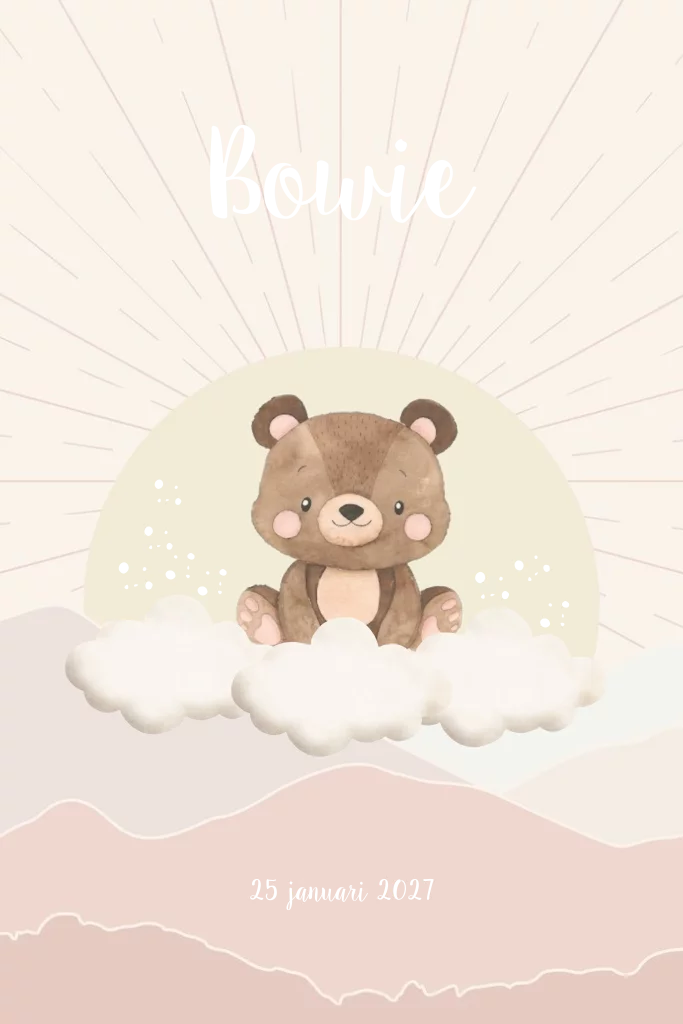 Lief geboortekaartje voor een meisje met de zon, bergen, zwevende wolkjes met beertje erop. (23801)