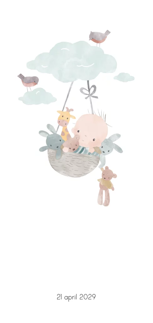 Geboortekaartje voor jongen of meisje met baby zwevend in een mand in de lucht / luchtballon. Met diertjes en wolkjes. (23779)