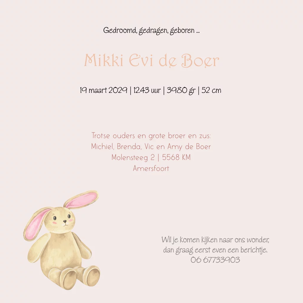 Geboortekaartje meisje met konijnenknuffel, bloemen en hartjes. (23813)
