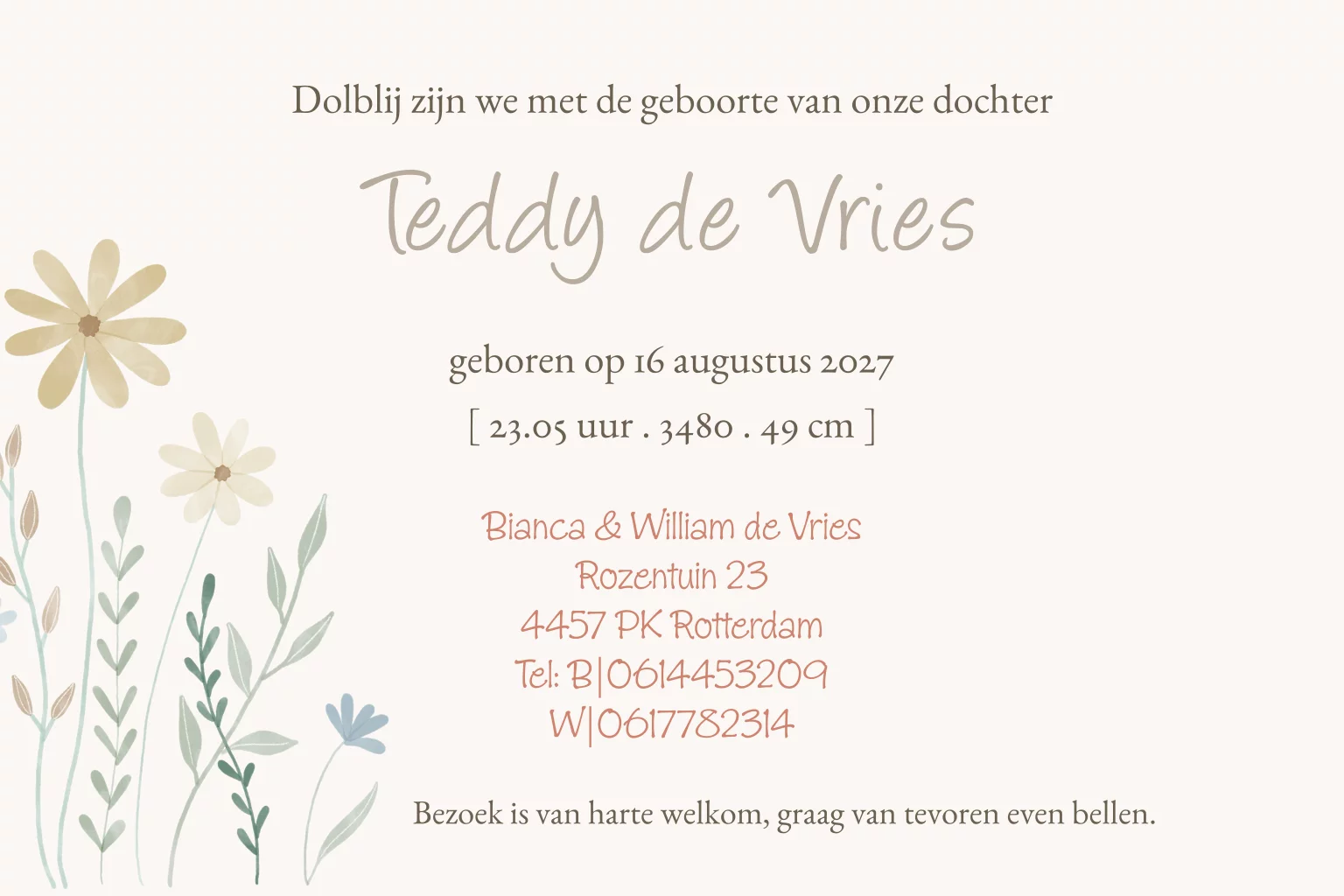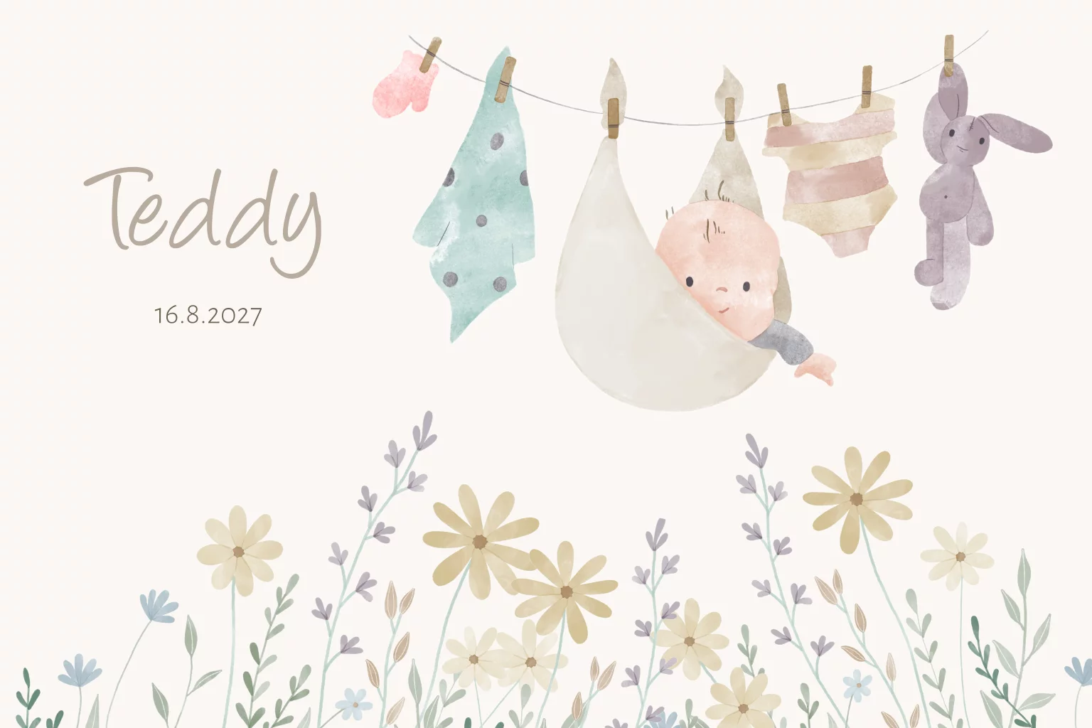 Geboortekaartje voor jongen of meisje met baby aan waslijn met kleding en knuffels tussen de bloemen. (23780)