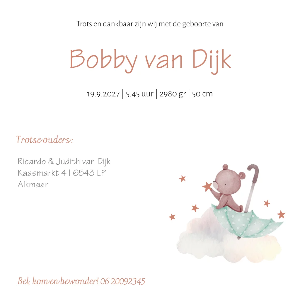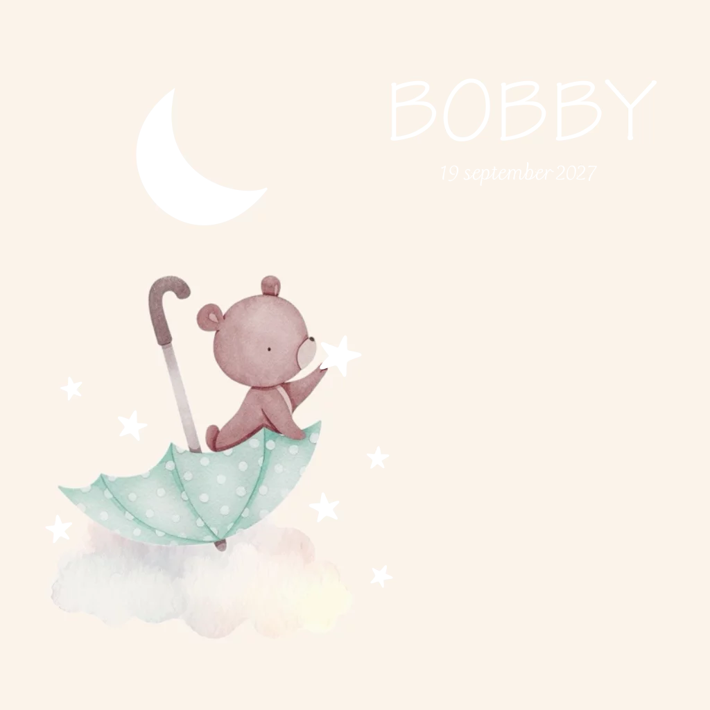 Lief getekend geboortekaartje voor een jongen of meisje met zwevend beertje in paraplu met wolk, maan en sterretjes. (23824)