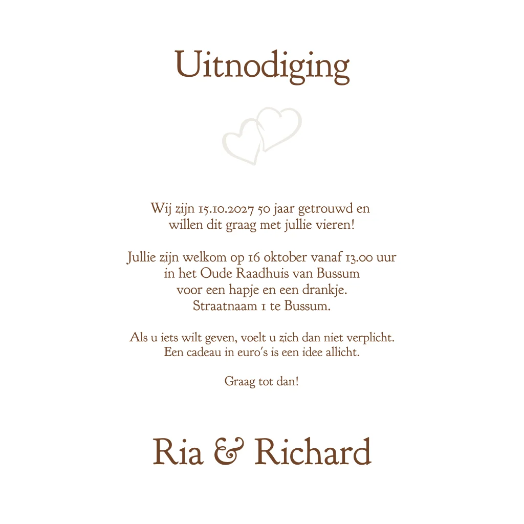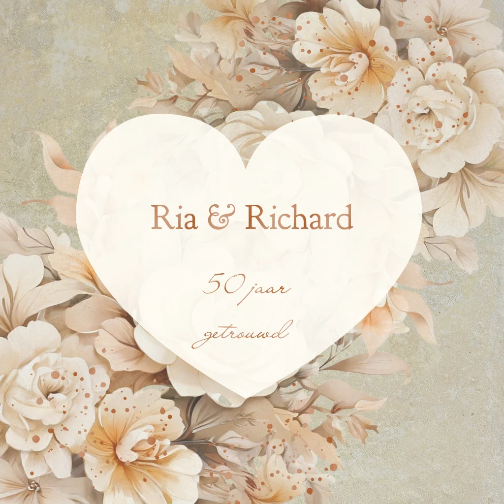 Uitnodiging 50 jaar getrouwd feest in romantisch klassiek thema met grote witte bloemen en een hart. Namen zijn in hoogglans geschreven. ( 24548)(Deze kaart heeft nu ronde hoeken a € 0,30 extra per kaart, in je kunt dit ook met rechte hoeken bestellen)