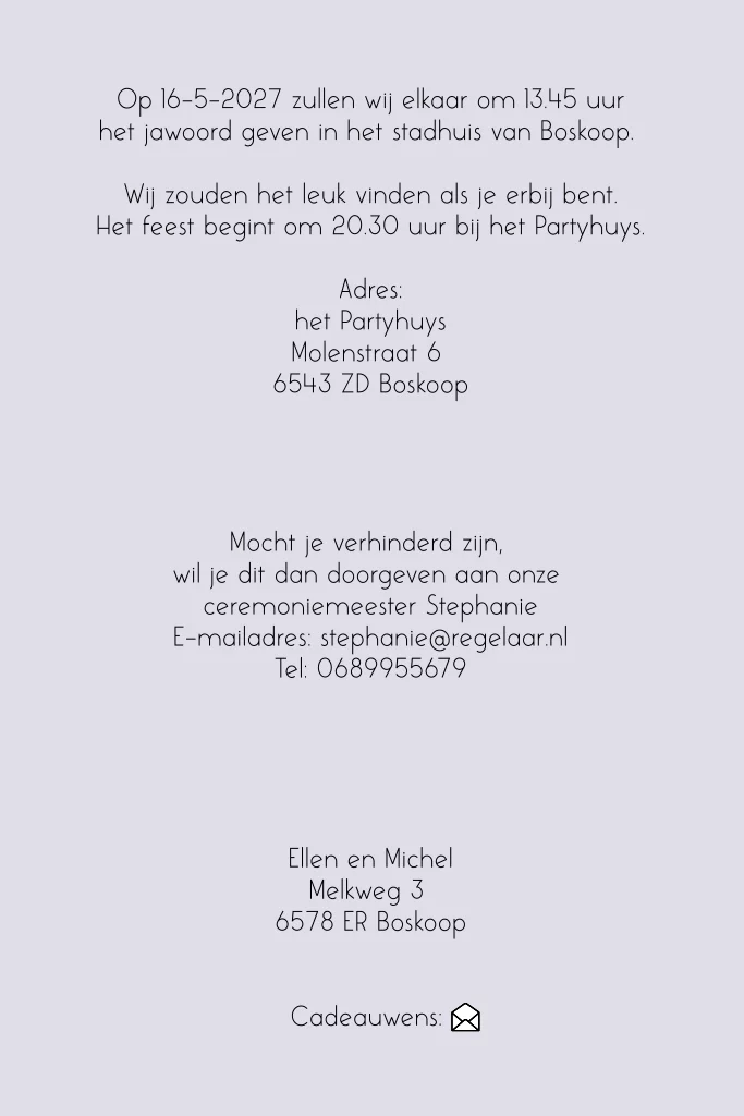Trouwkaart met waterverf bloemen en takken in paars blauwe tint. (24601)
