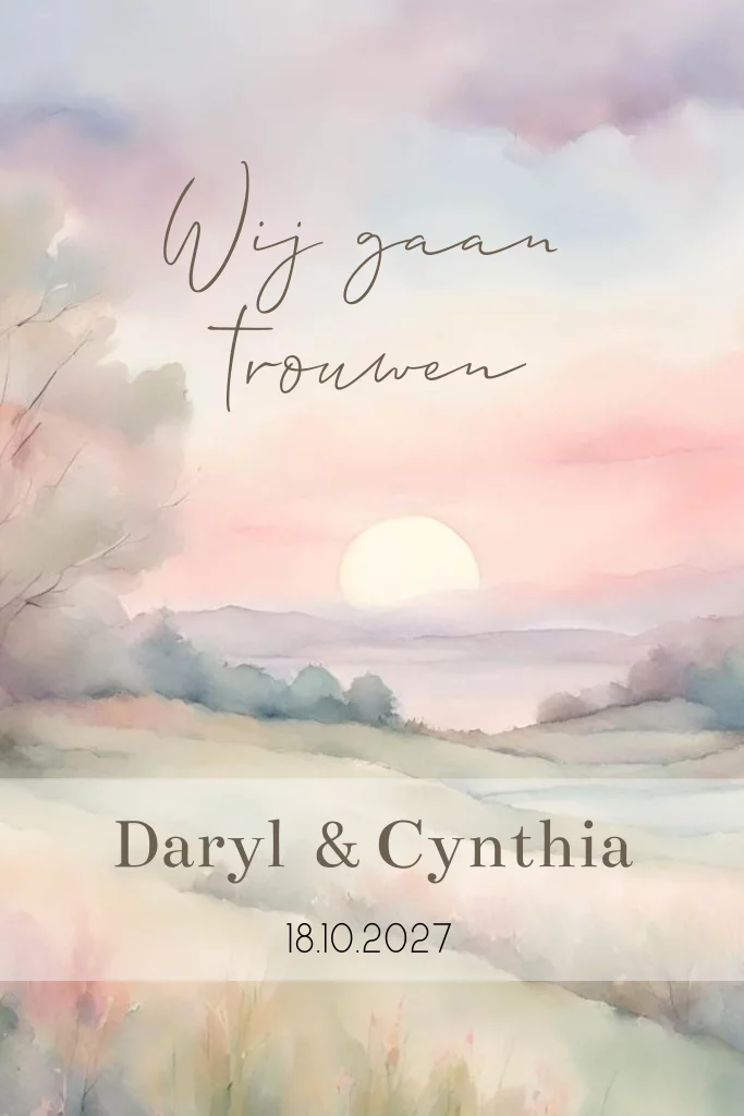 Trouwkaart met een pastelkleurig landschap en zonsondergang
