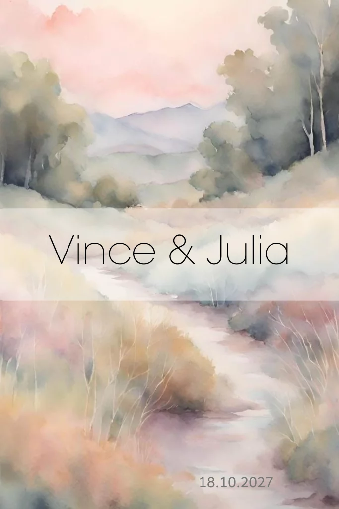 Trouwkaart met een tekening in watercolor van een landschap met bomen. In pastelkleuren. (24597)