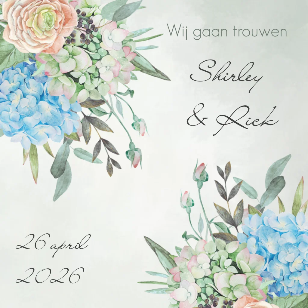 Romantische trouwkaart met bloemen in pastelkleuren geschilderd op een groene achtergrond met afgeronde hoeken (24589)