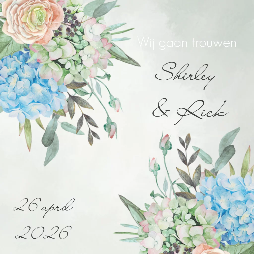 Romantische trouwkaart met bloemen in pastelkleuren. (24589)