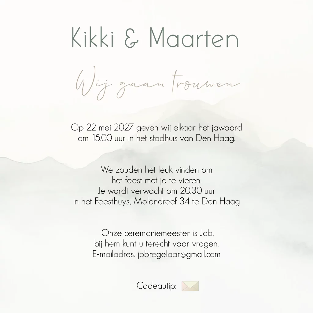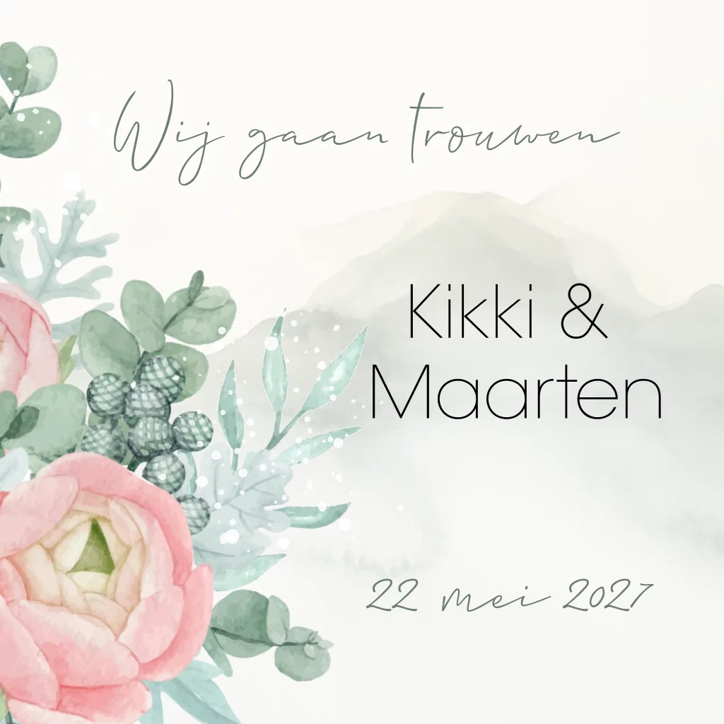 Trouwkaart romantische roze bloemen en groene bladeren