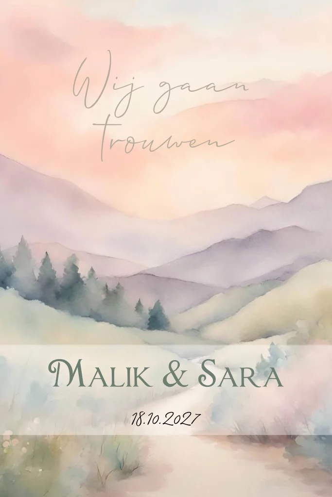 Trouwkaart met een aquarel van een bergen landschap in zachte pastel kleuren. (24593)