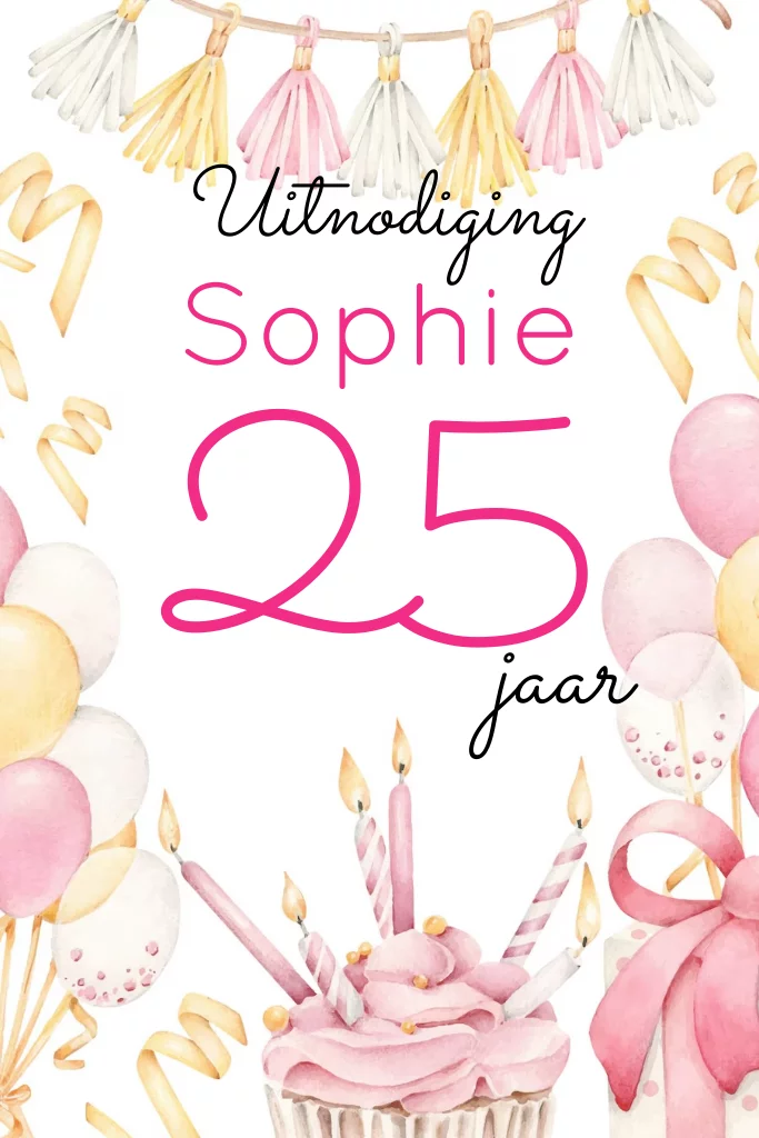 Uitnodiging voor een verjaardag vrouw 25 jaar met ballonnen en een cupcake. (24682)