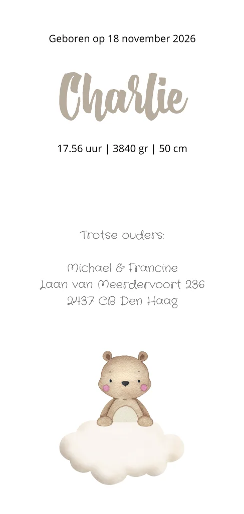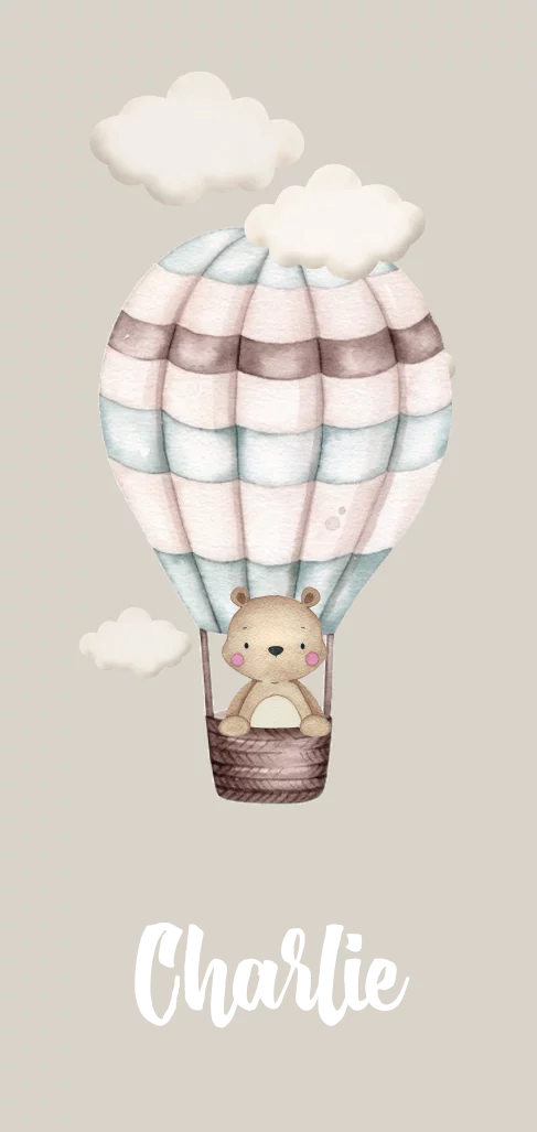 Lief neutraal geboortekaartje met beer in luchtballon