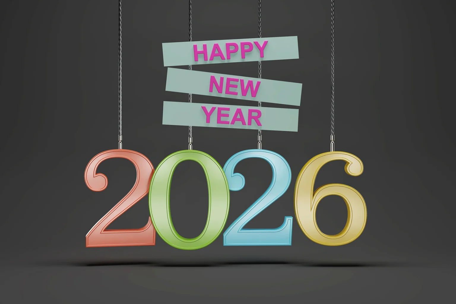 Leuke kerstkaart met de cijfers 2026 die aan een staalkabel hangen (24727)
