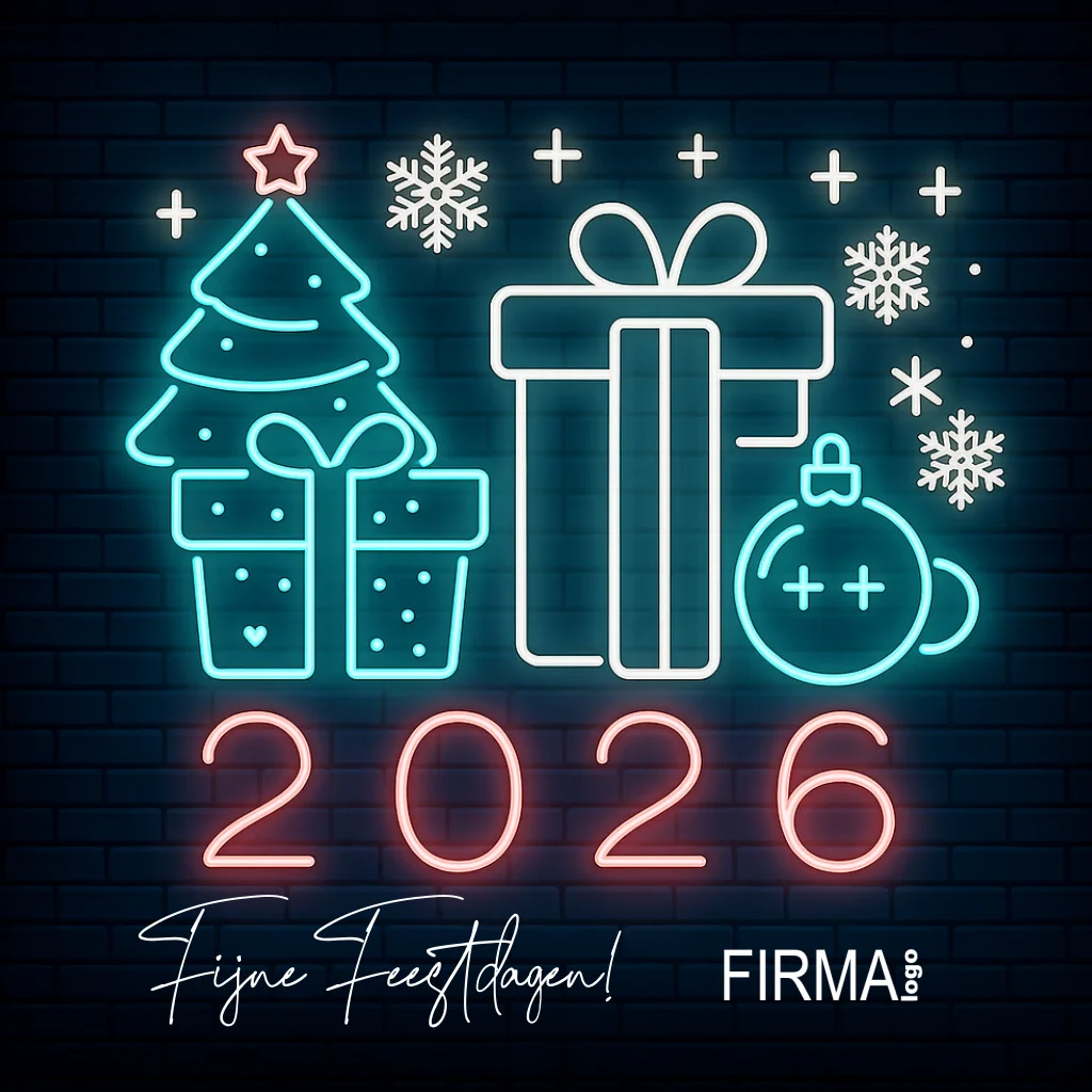 20265 kerstkaart met neon lampjes kerstboom, cadeau op een zwarte muur achtergrond. (24729)