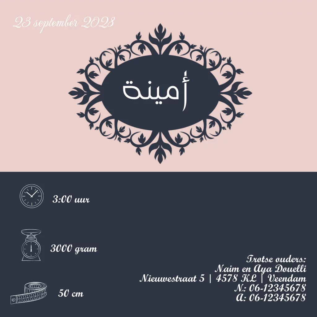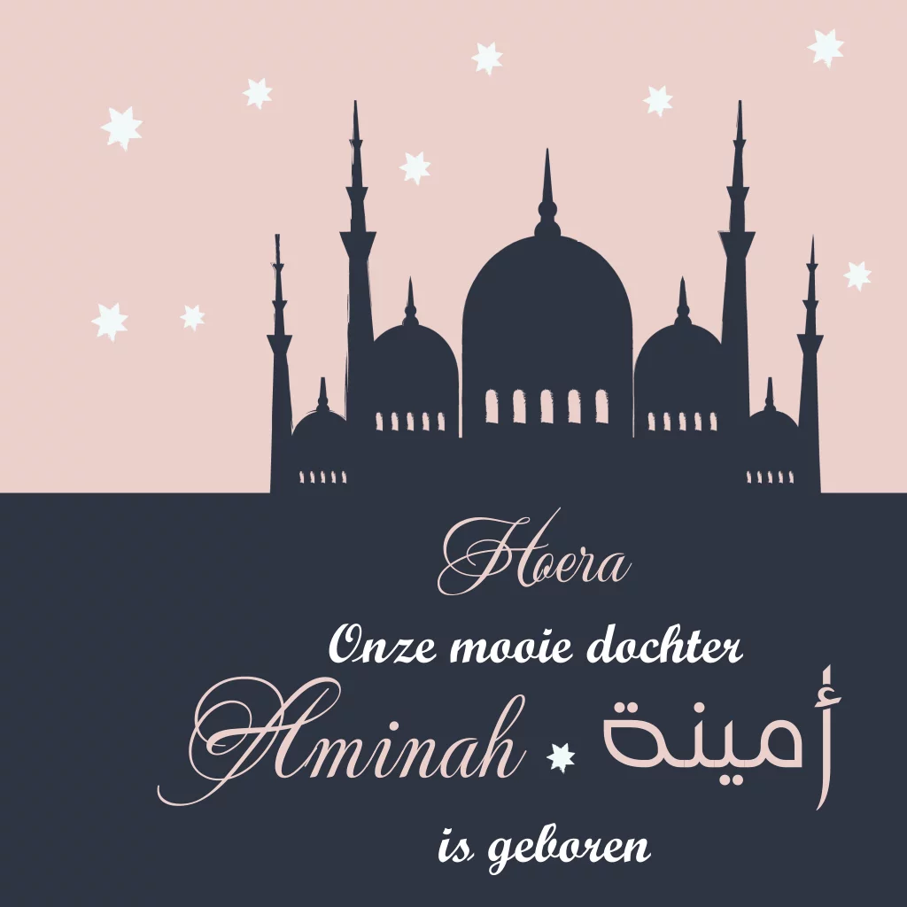 Arabisch geboortekaartje moskee met sterren in paars