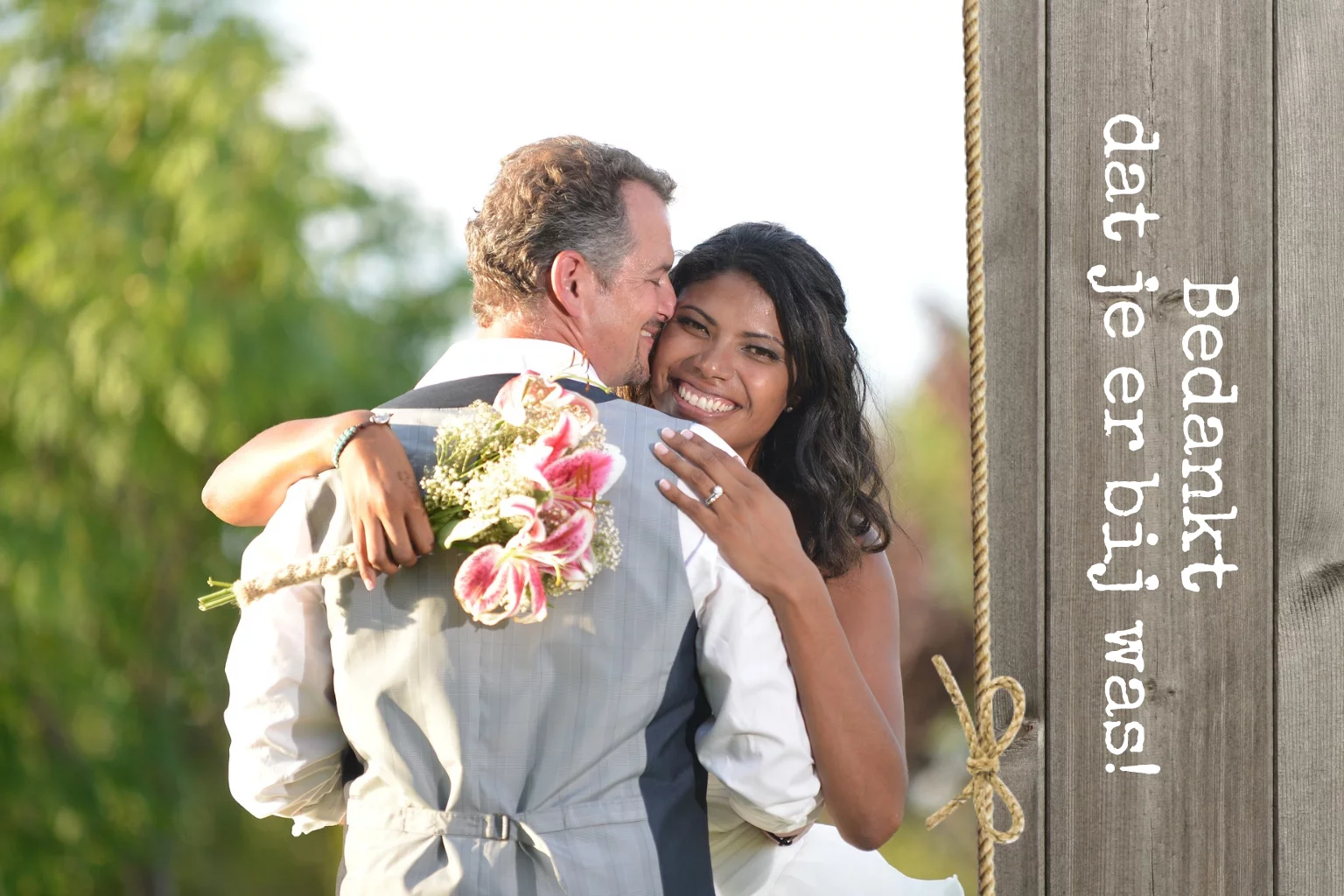 Liggende bedankkaart huwelijk met foto en strikje Upload je eigen foto en plaats je eigen tekst (3550)