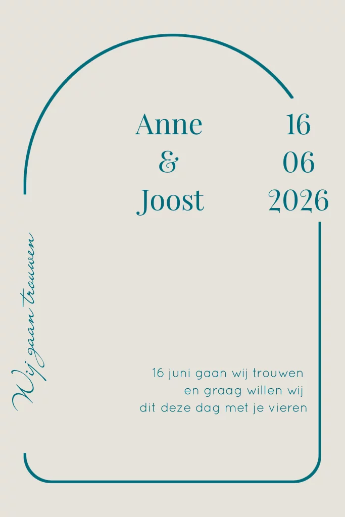 Trouwkaart in de kleuren beige en petrol met een boogvorm op de voorkant.