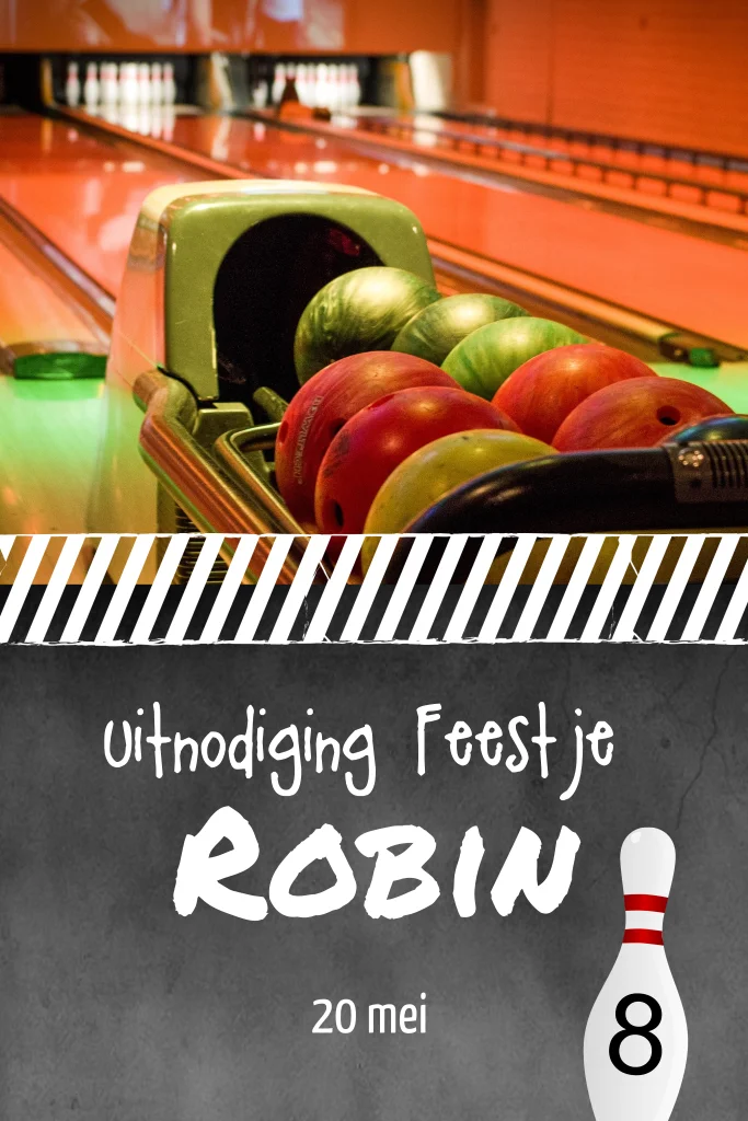 Leuke uitnodiging om te gaan bowlen met een kinderfeestje. Plaats eventueel je eigen foto op de voorkant ipv de foto met de bowlingballen. (2717)