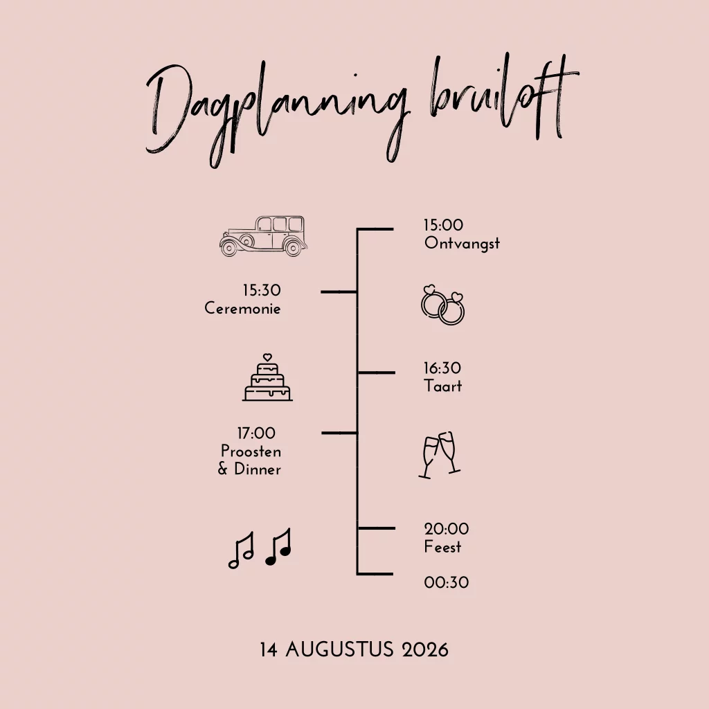 Dagplanning kaartje bruiloft in het vierkant. De kleuren en symbolen en lettertypes kunnen eenvoudig naar wens worden aangepast.