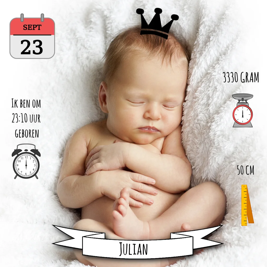Foto geboortekaartje jongen met kroon en geboorte symbolen