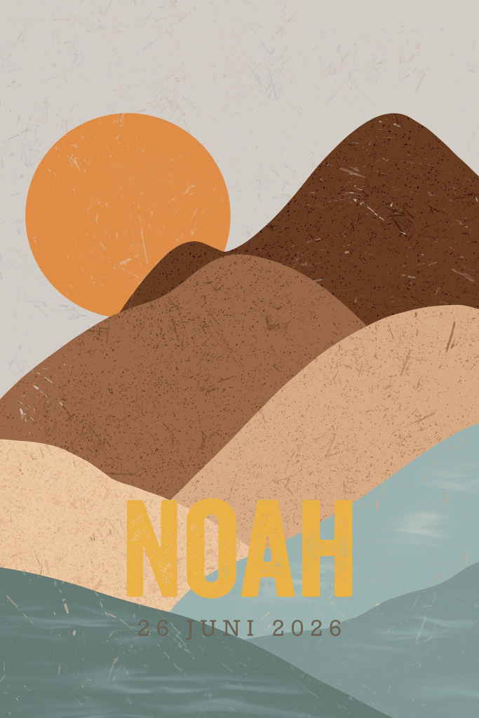 Geboortekaartje bergen voor een jongen met ondergaande zon. Dit in warme boho kleuren.