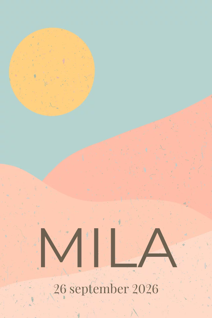 Geboortekaartje bergen voor een meisje met zon en ronde hoeken. Kleuren zijn pastel roze en lichtblauw.